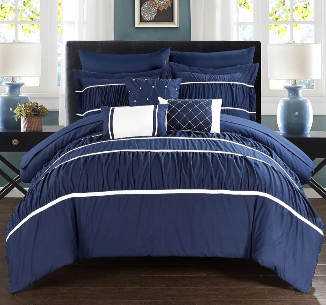 A fashion forward bed in a bag ruffled comforter set with everything you need for a complete bedroom décor makeover. Elegant and sophisticated embellished pleated comforter set with ruffle details. Super-soft microfiber sheets, design coordinated shams and deco pillows are included to complete the look.