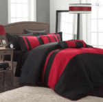 A fashion forward color block Comforter set with everything you need for a complete bedroom décor makeover. The Comforter features a simple yet elegant color block design with ruffles and embroidery details. Super-soft microfiber sheets, design coordinated shams and deco pillows are included to complete the look.