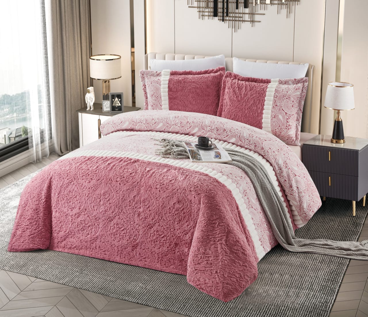 Faux rabbit fur comforter set.